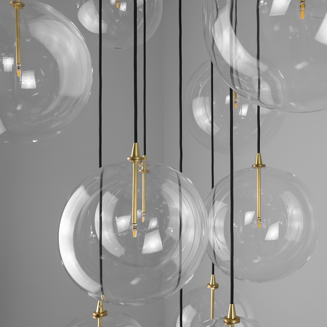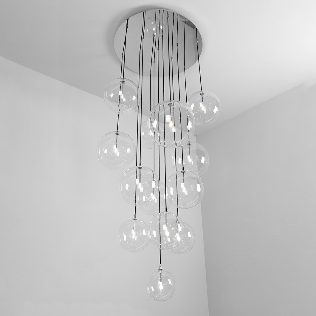 The Cluster 13 Mix Chandelier by Schwung is a beautiful composition of thirteen glass globes, creating a modern and luxurious statement in a lavish setting. Varying in diameters, the transparent glass bubbles descend in a pyramid-like shape, forming a descending luminaire that exemplifies elegance.