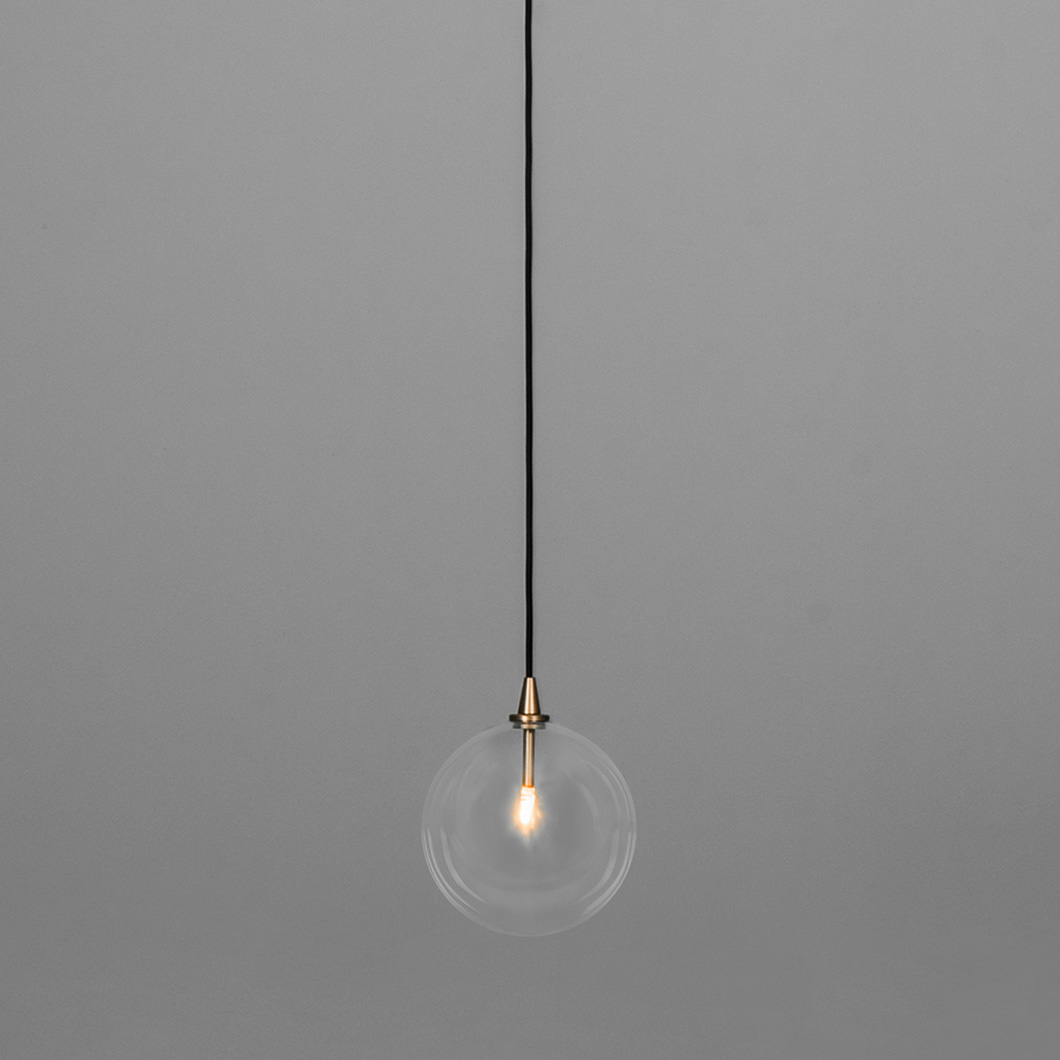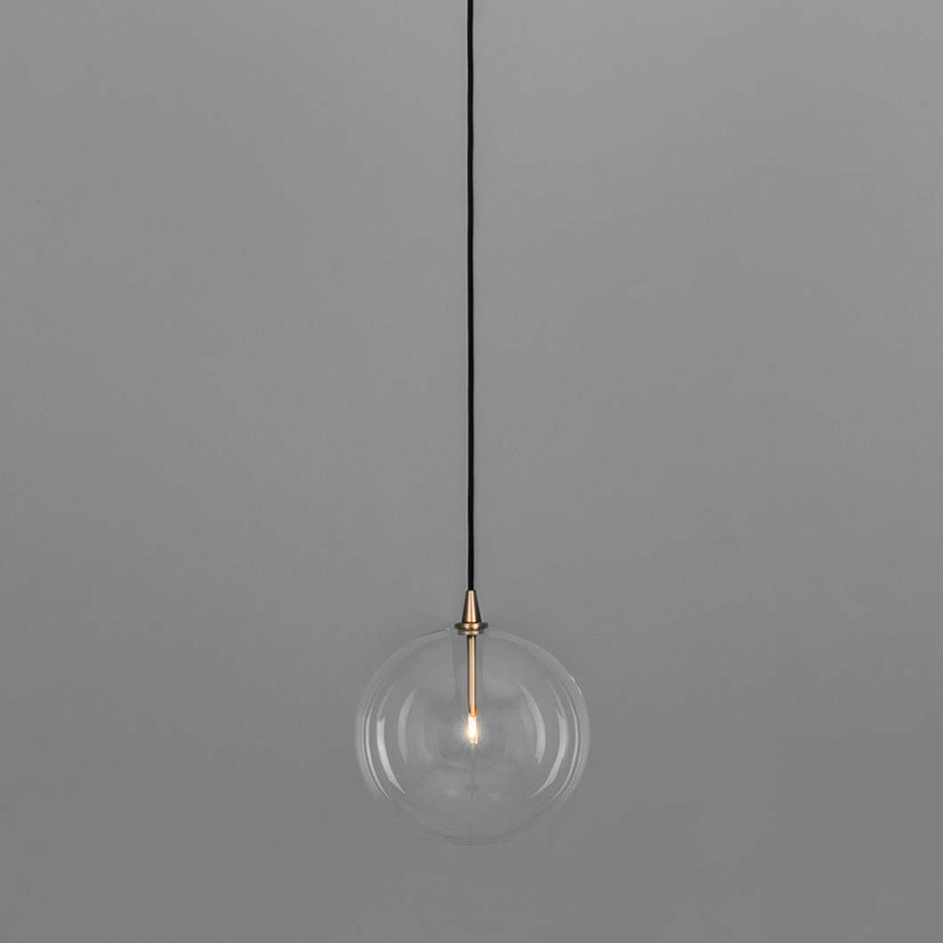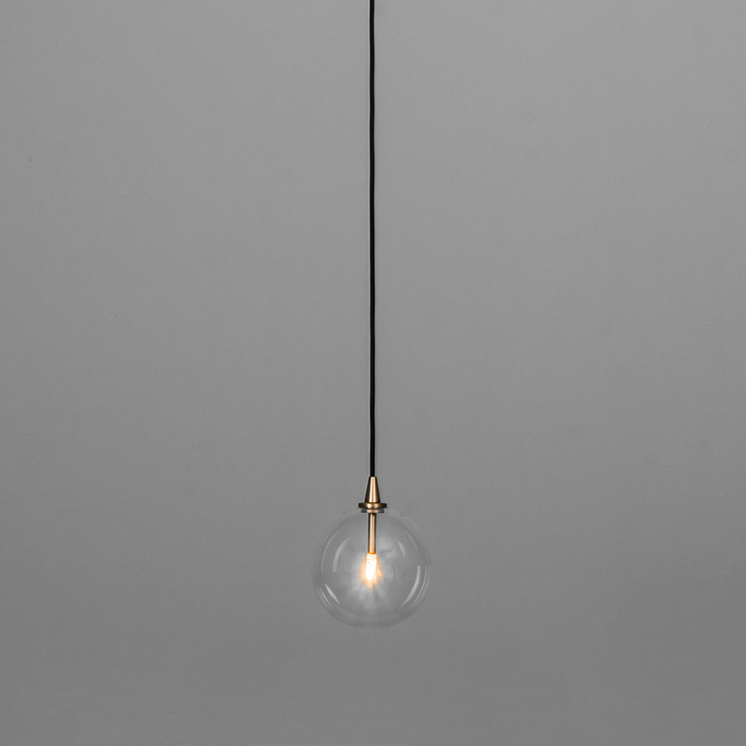 Minimalist elegance and timeless appeal define the Glass Globe Pendant by Schwung. This modern suspension light expresses its simple design through its singular clear glass bubble and linear structure. Mounted by a small round canopy, the Glass Globe floats weightlessly, suspended by an elongated textile cable.