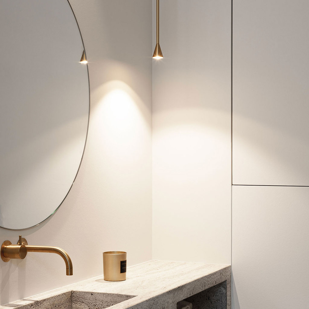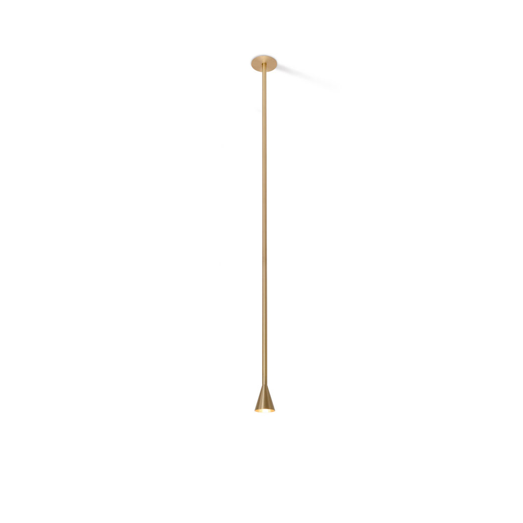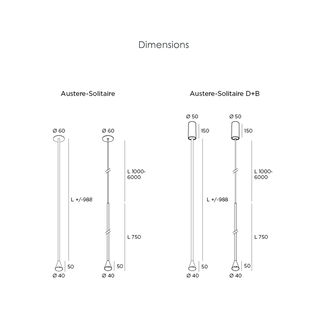 Austere-Solitaire is available in 8 versions; choose between a fixed rod (RF), long vertical rod (RL), and either an integrated (D+B) or remote driver. For false ceilings, choose the base version; for those looking for a concrete ceiling light, select the appropriate version (C) above. On offer is a TRIAC/IGBT dimmable driver. Additional drivers are available on request, please enquire for more information. Please note: remote drivers are not included as standard but are required, however, integrated drivers are included as standard with D+B versions only. LED included. Available in a stunning brass coating, as well as a classic black or white finish.