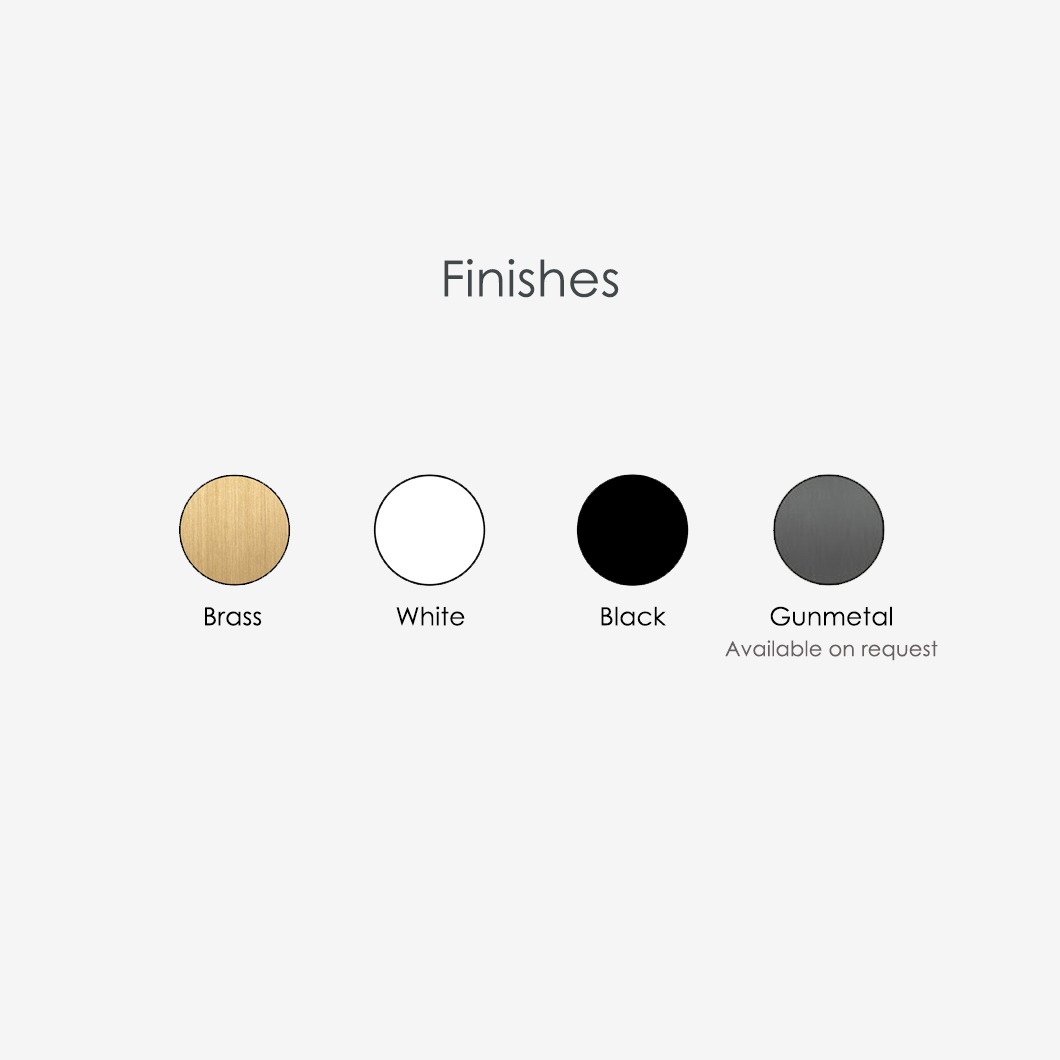Finish options: brass, black, or white.