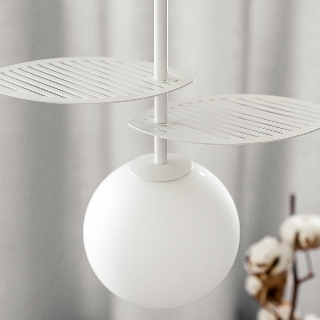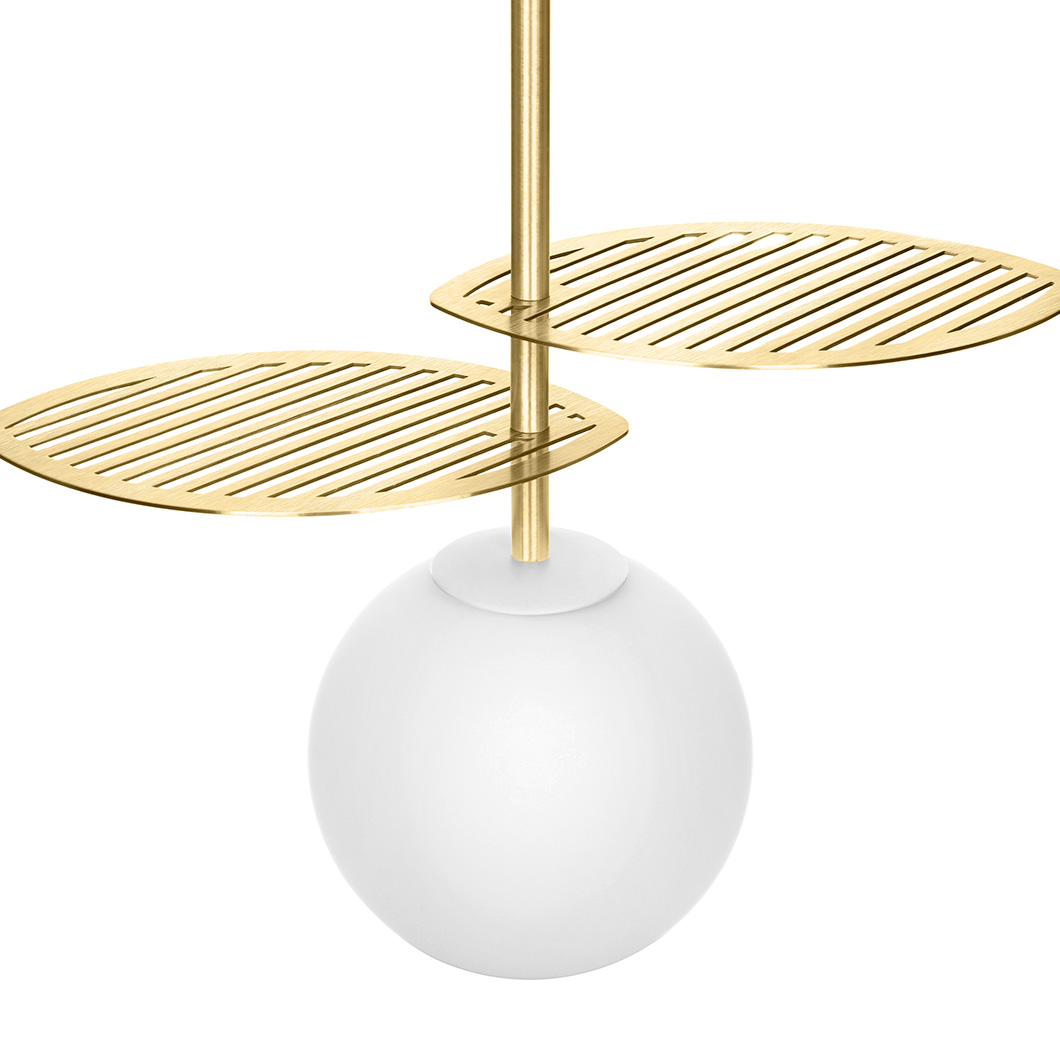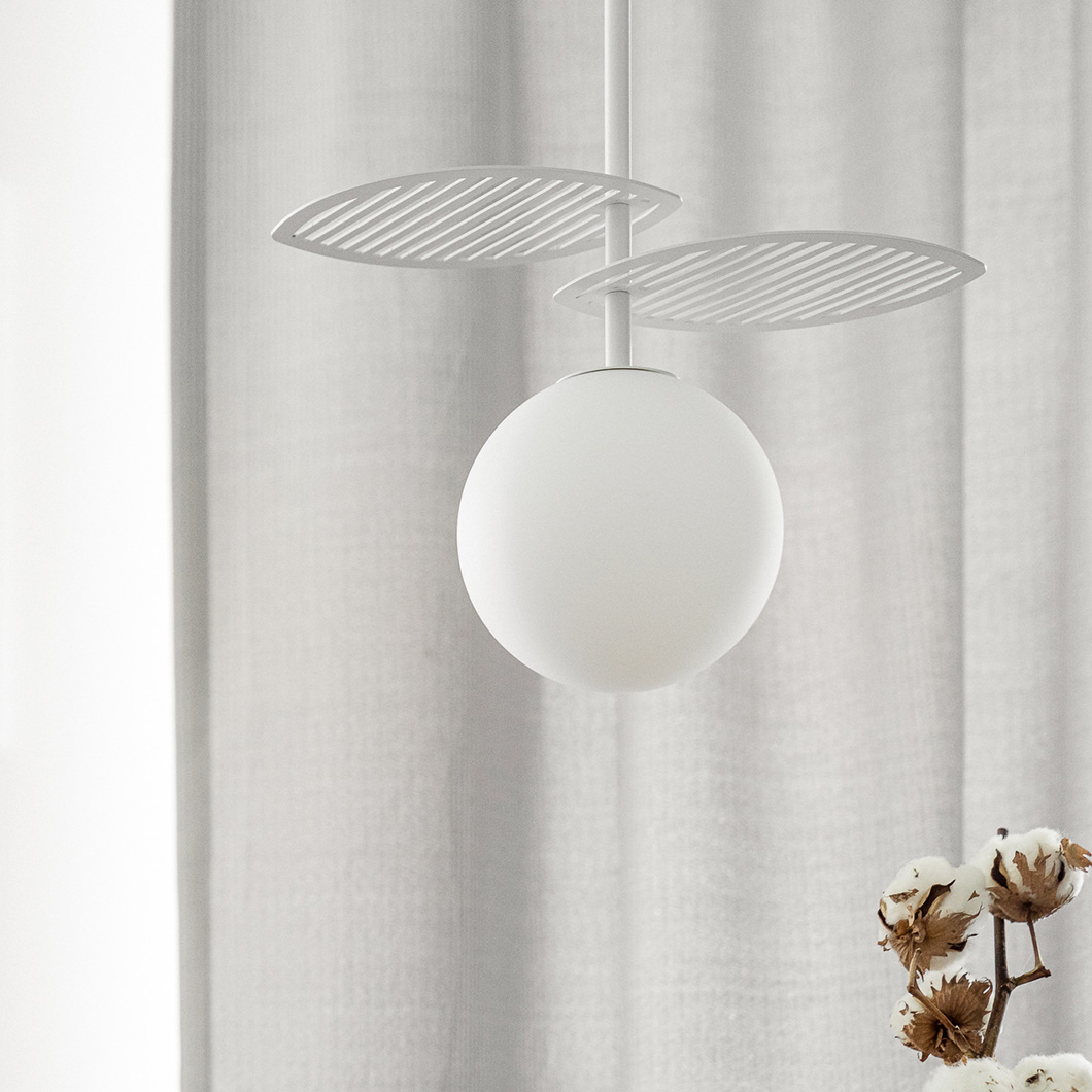 Inspired by nature, the Fyllo Pendant by UMMO Lighting flaunts a geometric leafy form that uniquely diffuses light from the central glass globe. Featuring UMMO's iconic milky white glass sphere, the contemporary suspension light shows how minimalist design can make a statement in a modern space. The intricate composition is crafted from metal with available in three sleek finishes.