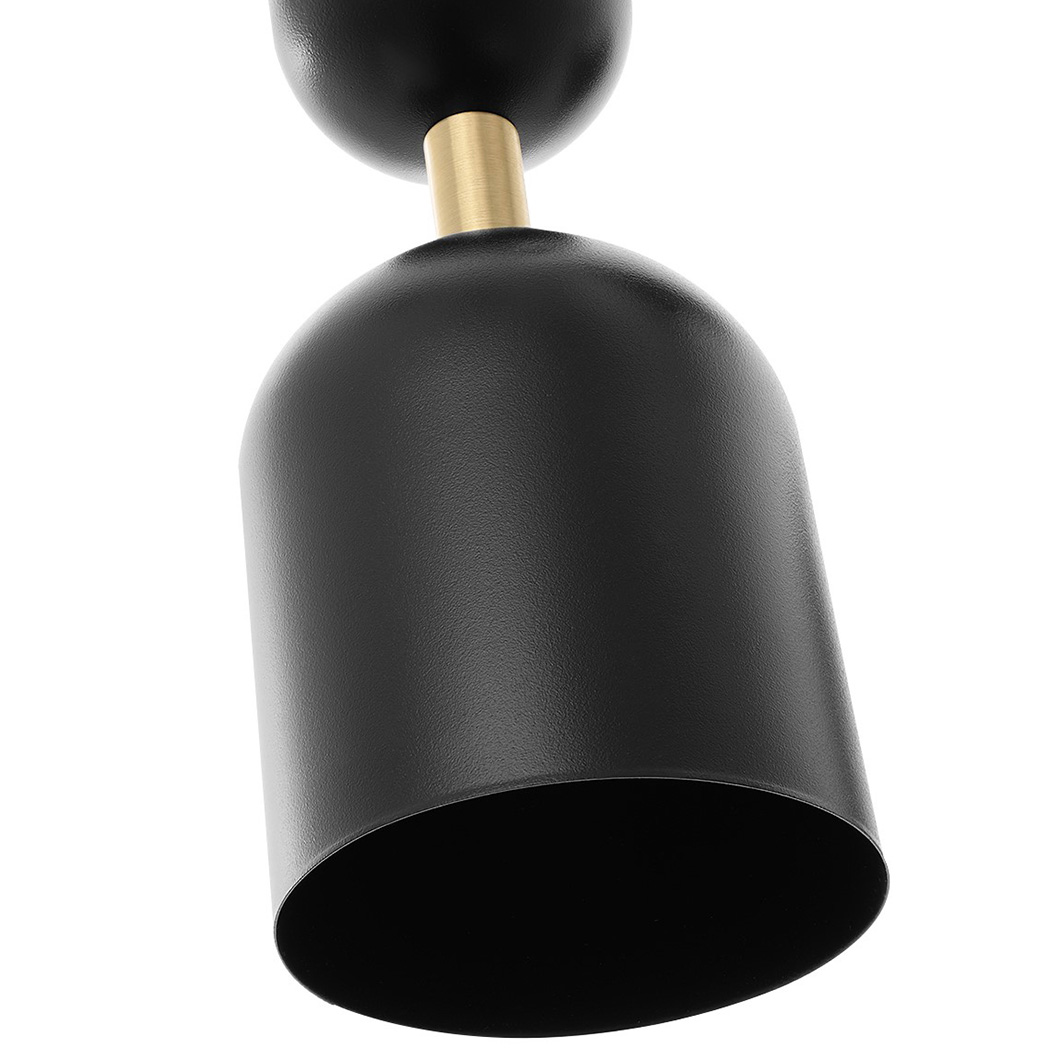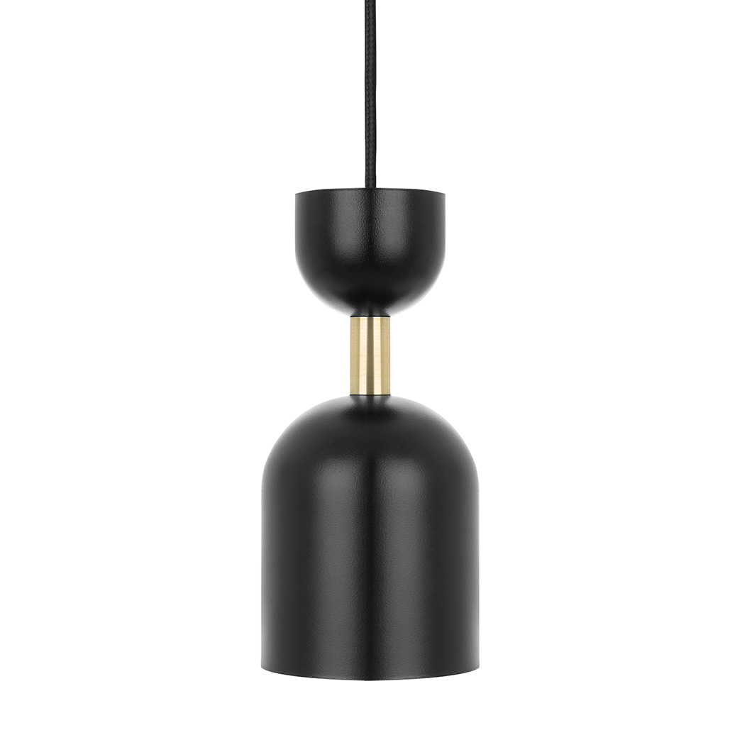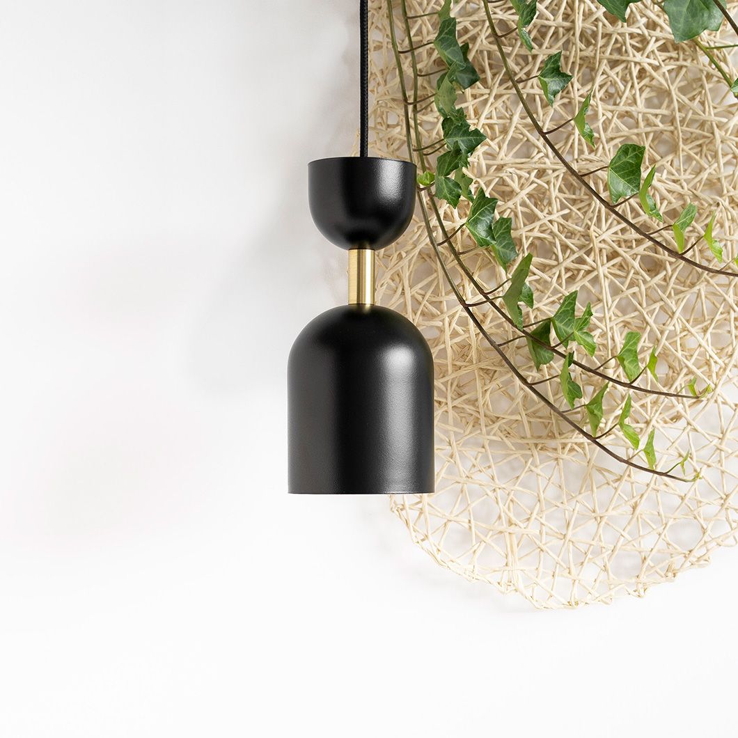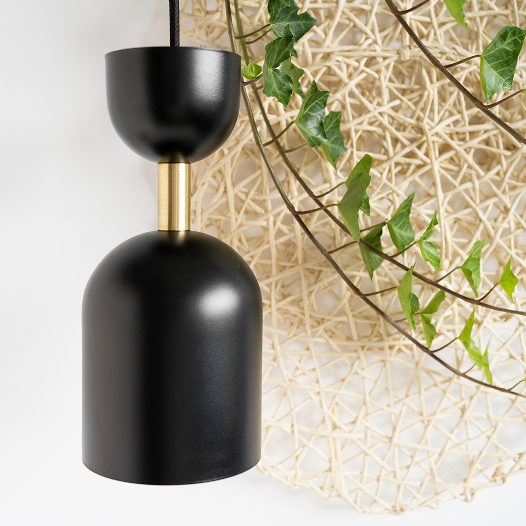 The metallic luminaire is powder-coated in a sleek black finish with a brass tube connecting the two domes. This combination enhances the sophistication of the pendant, its trendy colour scheme seamlessly elevating various indoor environments.