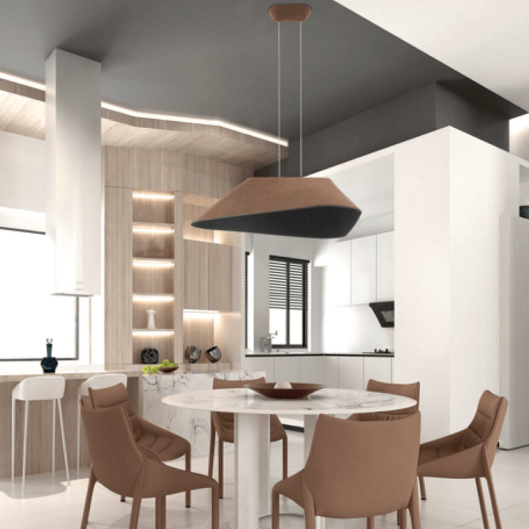 Combining minimalist style with high-performance LED illumination and sound-absorbing materials, the 23172 Pendant by Zambelis prioritises comfort both visually and acoustically. The stylish suspension light features a curved, triangular shape made with integrated acoustic panels and finished in brown to match clean, simple interiors. The acoustic panels help to reduce noise, enhance sound quality, and build a quieter, more pleasant atmosphere.